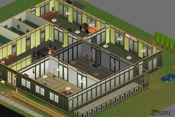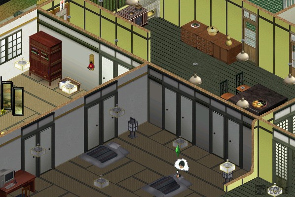 鬼兵隊のお家内部です。 二人暮らしなので私的には割と貧相に作ってます。(^-^; 玄関入って左は風呂とトイレ2つ。 奥はリビングです。 ここはダイニングキッチン。 玄関右手は和室2つ。 片方は居間、もう片方は寝室。 画像を撮った時は高杉が和布団で寝ています。 一番奥は遊びの部屋で日本刀なんかを置いてます。 |