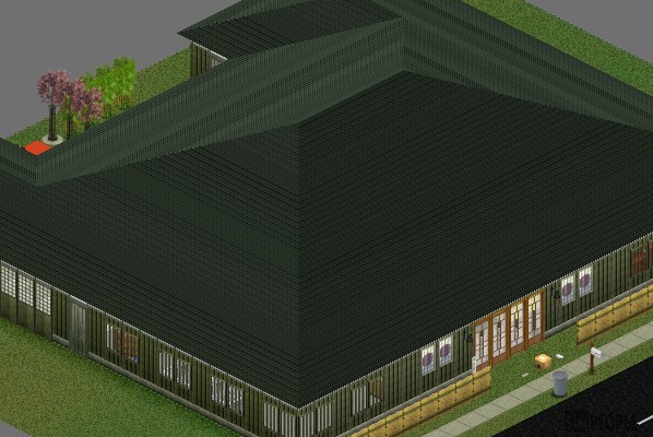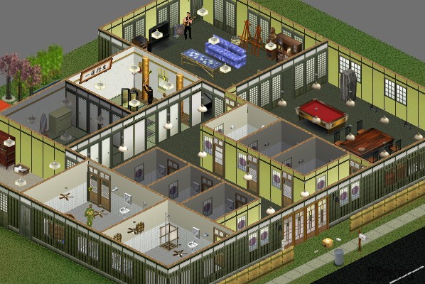 真選組の家内部。 右手中央が玄関。 入って左右にトイレが各3つずつ。 左側がお風呂2つ。 その奥は近藤達4人の寝室。 廊下の奥2間続きの和室、左はミツバちゃんの部屋。 右は居間。 玄関から右はLDK。 ビリヤード台があったりします。 一番奥の部屋はリビング。 テレビやソファセットなんかあったり。 |